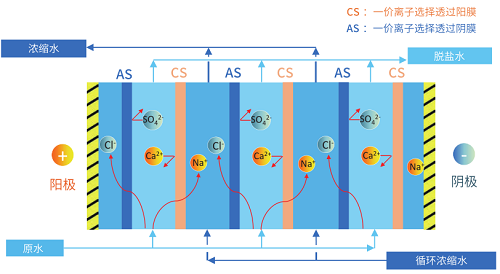 倒極電滲析技術(EDR)將陰、陽離子交換膜交替排列于正負電極之間,并用特制的隔板將其隔開,組成除鹽淡化和濃縮兩個系統。在運行時不斷地倒極,去除水中的污染離子的同時降低二價離子對膜的污染,延長了離子交換膜的使用壽命。EDR技術采用高效擴散膜,可使鹽分高度濃縮至20%,大大降低了后續蒸發所需的能耗。同時可根據用戶的需要定制一價離子選擇透過膜實現一二價離子分離從而實現鹽的分類回收的目的。
