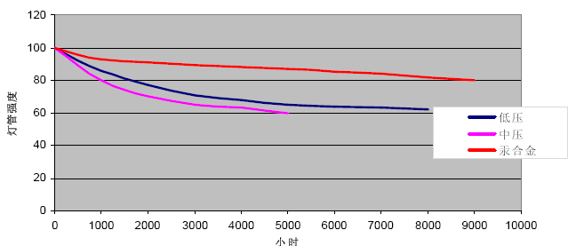 紫外線殺菌器是純水系統一種常用的對水體進行殺菌消毒的設備,紫外線燈管的使用壽命不是指燈管熄滅的時間,而是指燈管的發光效率低于消毒殺菌所需要的有效值,無法提供足夠的紫外線輻射量,從而影響殺菌消毒的效果。影響燈管使用壽命的主要原因是燈管內部的汞會慢慢釋放到燈管內壁,因此會逐步影響燈管的紫外線強度。為了保證紫外線殺菌器的殺菌效果,必須定期更換紫外線燈管。各類燈管使用壽命如下圖: